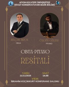 Afyon Kocatepe Üniversitesi Devlet Konservatuvarı Müzik Bölümü tarafından düzenlenen Obua–Piyano Resitali, 21 Kasım 2025 tarihinde saat 14.00’te İbrahim Küçükkurt Salonu’nda gerçekleştirilecektir. Etkinlik kapsamında, müzik alanında çalışmalarını sürdüren değerli sanatçılar Selçuk Akyol (Obua) ve Özgün Gülhan (Piyano) sahne alacak olup, klasik müzik repertuvarından seçkin eserler dinleyicilere sunulacaktır. Afyon Kocatepe Üniversitesi Devlet Konservatuvarı olarak tüm öğrencilerimizi, akademik personelimizi ve müzikseverleri bu nitelikli sanat etkinliğine davet ederiz.