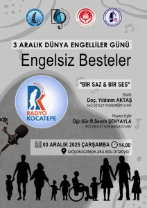 Engelsiz Besteler (Konser) 3 Aralık Dünya Engelliler Günü etkinlikleri kapsamında, “Bir Saz & Bir Ses” R. Semih Şenyayla ve Doç. Yıldırım AKTAŞ’ın hazırladığı “Engelsiz Besteler” programı ile 03 Aralık 2025 – 14.00’da RADYO KOCATEPE’nin konuğu oluyorlar. 01 Aralık 2025, Pazartesi 15 kez görüntülendi