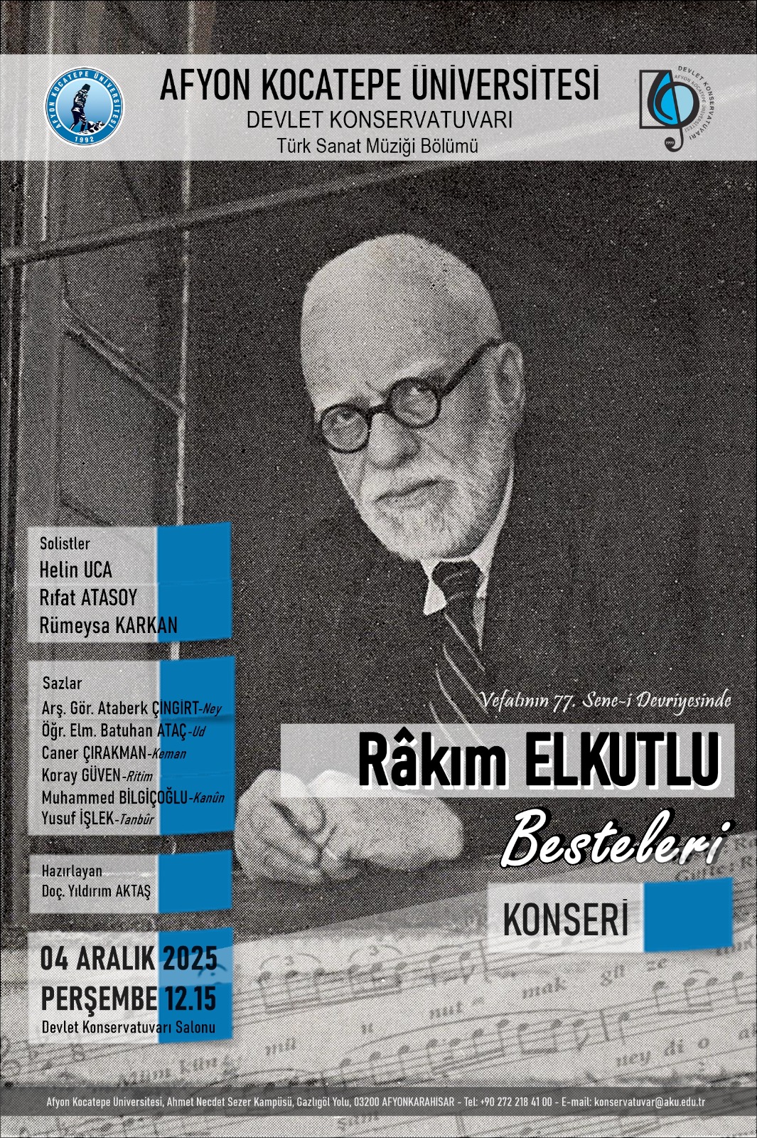 Klasik Türk Müziğinin Hafız Bestekârlarından, Hoca Rakım Elkutlu Vefatının 77. Yılında konserle anılıyor. Doç. Yıldırım Aktaş tarafından hazırlanan konserde eşsiz bestelere imza atan Rakım Elkutlu’nun eserlerinden örnekler Afyon Kocatepe Üniversitesi Devlet Konservatuvarı Türk Sanat Müziği Bölümü sanatçıları tarafından seslendirilecektir. Konser; 04 Aralık 2025 Perşembe 12.15’de AKÜ Devlet konservatuvarı salonunda sergilenecek olup halka açık ve ücretsizdir. Rakım Elkutlu’yu vefat yıl dönümünde saygı ve rahmetle anıyoruz.
