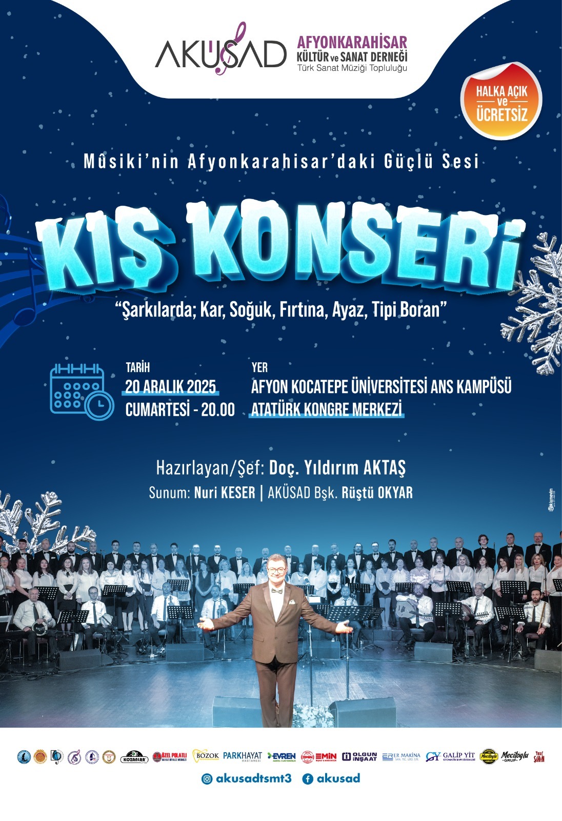 AKÜSAD (Afyonkarahisar Kültür ve Sanat Derneği) Türk Sanat Müziği Topluluğu, Afyon Kocatepe Üniversitesi Devlet Konservatuvarı, AKÜ Türk Müziği Topluluğu ortaklığında Şef Doç. Yıldırım Aktaş’ın hazırladığı ve yöneteceği 2025 yılının son konserinde; Şarkılarda, “Kış” teması ile 20 Aralık 2025 Cumartesi akşamı saat 20.00’da Afyon Kocatepe Üniversitesi Atatürk Kongre Merkezi Salonunda seyircisi ile buluşuyor. Konser halka açık ve ücretsizdir.