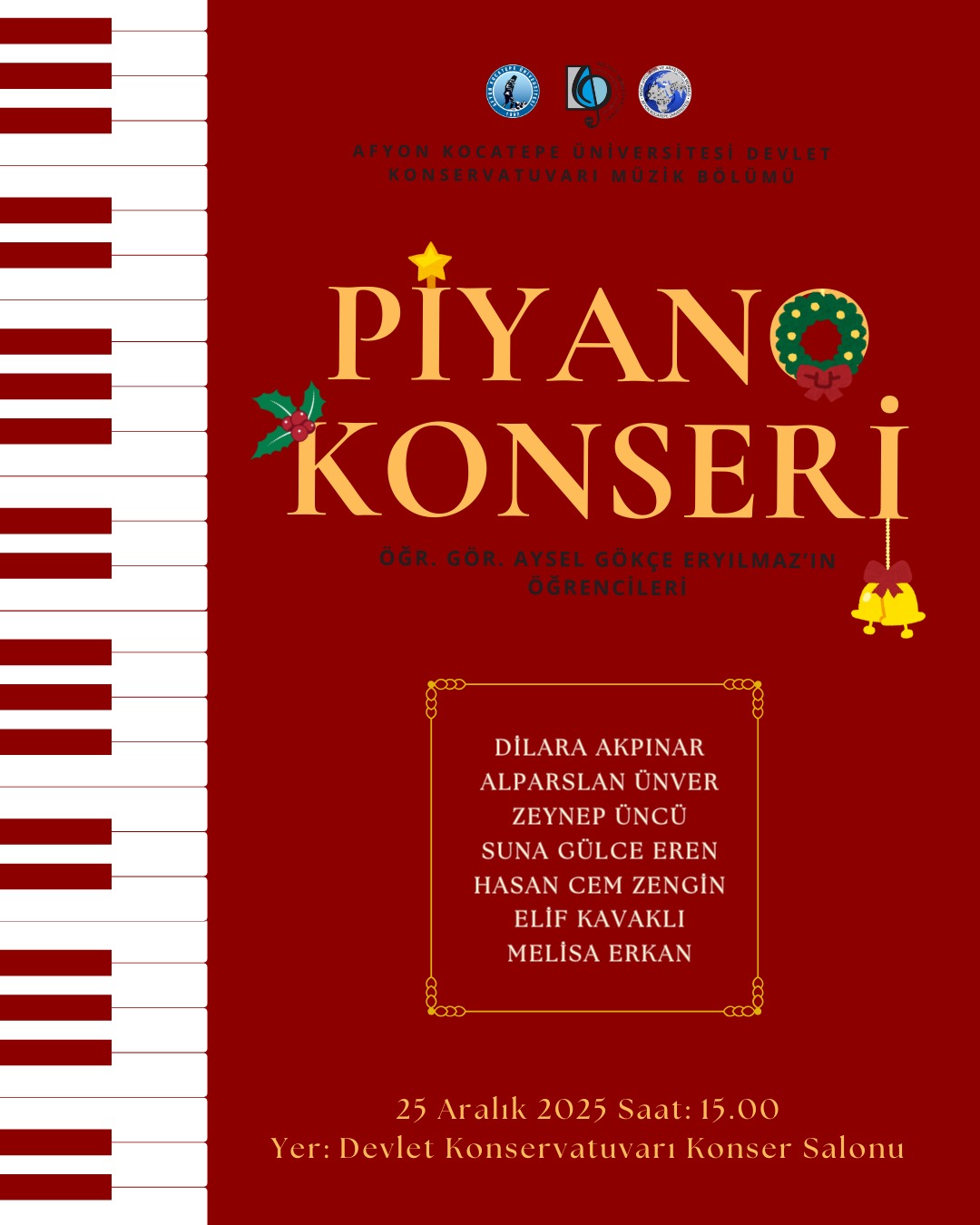 Piyano Konseri – Öğr. Gör. Aysel Gökçe Eryılmaz’ın Öğrencileri Afyon Kocatepe Üniversitesi Müzik Bölümü tarafından düzenlenen piyano konseri, Öğr. Gör. Aysel Gökçe Eryılmaz danışmanlığında hazırlanmıştır.