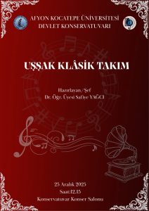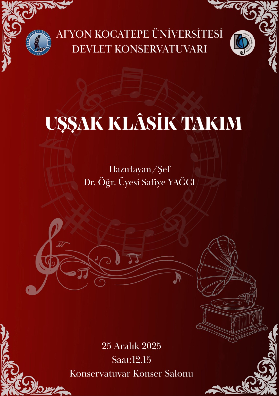 Uşşak Klâsik Takım (Konser) Dr. Ögr. Üyesi Safiye Yağcı yönetiminde gerçekleştirilecek olan konserde Uşşak makamında Klâsik Takım icrâ edilecek. Türk Sanat Müziği bölümü öğrencilerinin yer aldığı konserde ayrıca Uşşak makamında solo eserlere yer verilecek. 23 Aralık 2025, Salı 6 kez görüntülendi