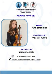 Afyon Kocatepe Üniversitesi Devlet Konservatuvarı Müzik Bölümü tarafından düzenlenen Keman Konseri, 17 Şubat 2026 tarihinde saat 19.00’da AKÜ Devlet Konservatuvarı Konser Salonu’nda gerçekleştirilecektir. Konserde, AKÜ Çocuk ve Gençlik Orkestrası Üyesi Duru Ceren EKİCİ sahne alacaktır. Program, Öğr. Elm. Gülşah TAZEGÜL danışmanlığında hazırlanmış olup, piyano eşliği Dr. Öğr. Üyesi Fakı Can YÜRÜK tarafından gerçekleştirilecektir. Tüm sanatseverler davetlidir.