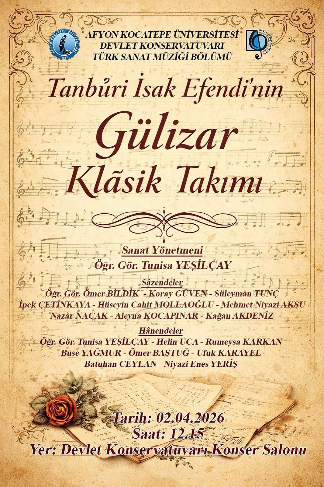 Tanburi İsak Efendi’nin Gülizar Klasik Takımı Afyon Kocatepe Üniversitesi Devlet Konservatuvarı Türk Sanat Müziği Bölümü tarafından hazırlanan Sanat Yönetmenliğini Öğr. Gör. Tunisa Yeşilçay’ın yapacağı “Tanburi İsak Efendi’nin Gülizar Klasik Takımı” konserine tüm sanatseverler davetlidir. 25 Mart 2026, Çarşamba 23 kez görüntülendi